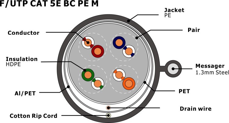 | Schild: | FTP, afgeschermd gedraaid paar | Productnaam: | F/UTP CAT5E PE met messenger |